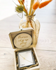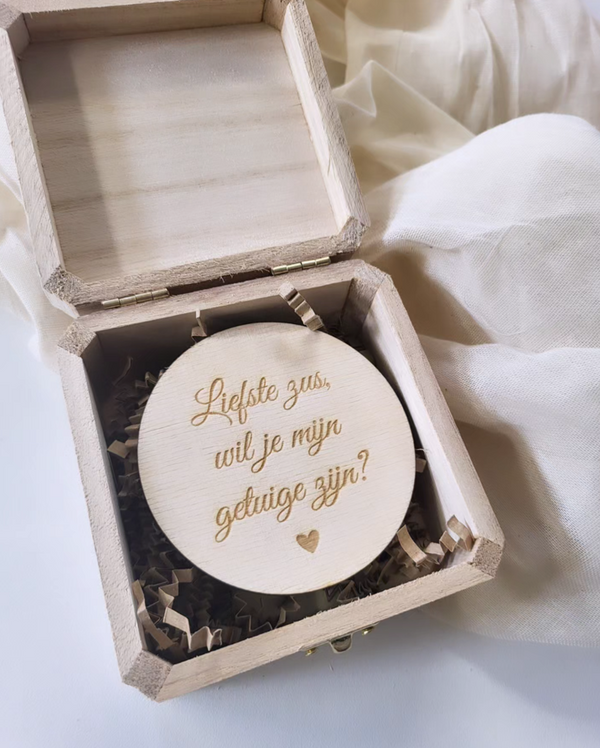 Houten vierkanten doosje met rond gegraveerd plaatje.