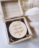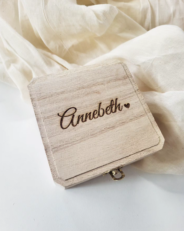 Het dekseltje zit aan het doosje vast met scharniertjes en deze wordt gegraveerd.