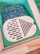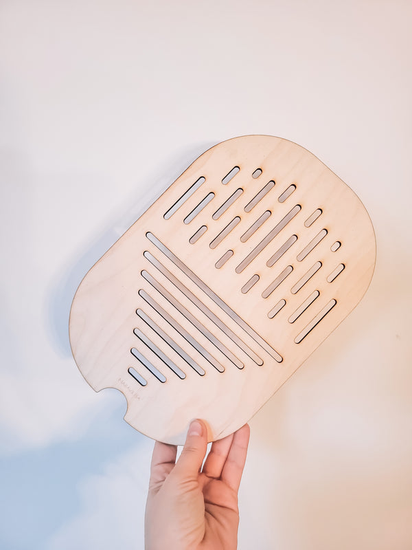 Hier zie je een inlegger met verschillende soorten gleuven in. Hier kan je eigenlijk eender welk materiaal laten doorsteken dat er tussen past, of gewoon aan de slag gaan met gekleurde rijst!